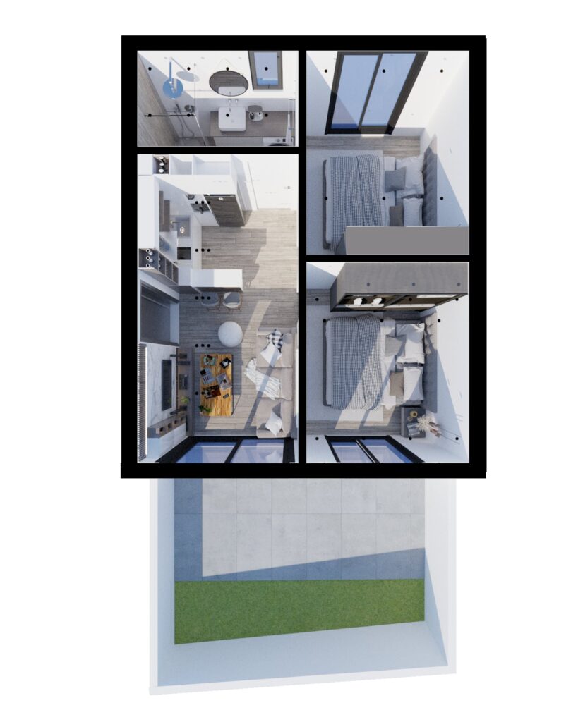 Es ist 39,42 qm groß, nach Süden ausgerichtet und befindet sich im Erdgeschoss des Komplexes. Es verfügt über 2 komfortable Schlafzimmer, Wohnzimmer, Küche, Bad und exklusive Nutzung des Gartens.